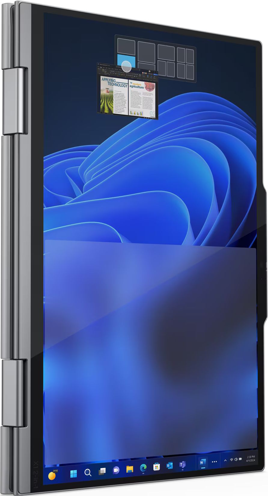 Wyświetlacz o przekątnej 14 cali z rozdzielczością 1920 x 1200 pikseli oferuje ostrą i czytelną obraz. Dotykowy panel ekranu umożliwia intuicyjną interakcję z zawartością, co w połączeniu z funkcją 2-in-1 pozwala na pracę w trybie tabletu. Urządzenie pracuje na systemie Windows 11 Pro, który zapewnia zaawansowane funkcje bezpieczeństwa i produktywności dedykowane środowisku biznesowemu.